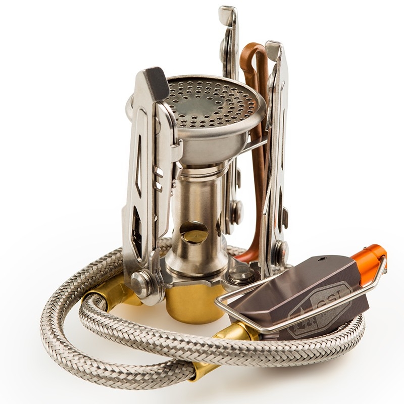 Vysoce efektivní plynový vařič pro externí připojení kartuše pomocí dlouhé kovové hadičky.