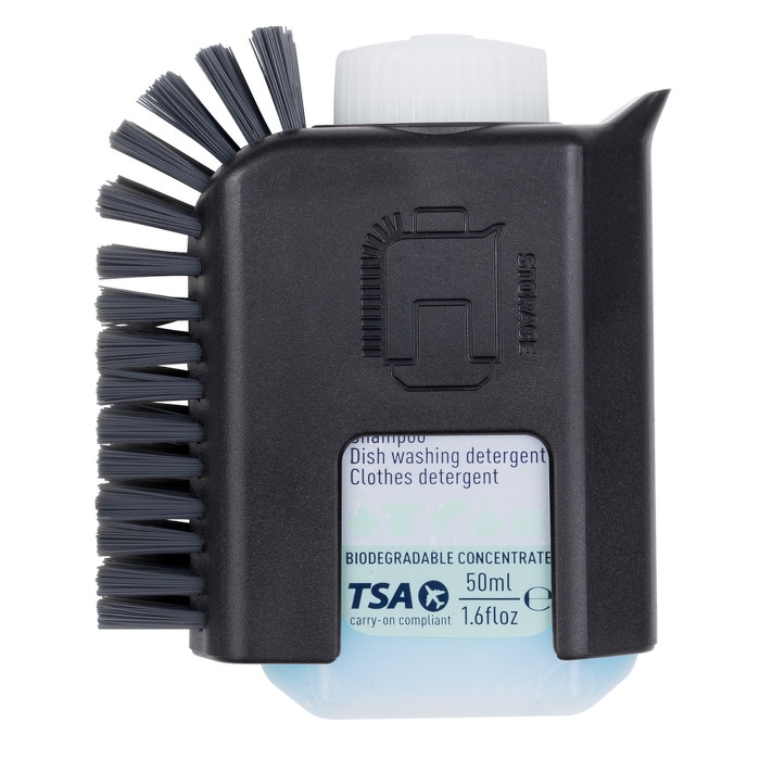 Kartáč je vyroben z lehkého materiálu a odolných štětin s integrovanou škrabkou na velké nečistoty. Mycí prostředek je bezpečný a vhodný pro veškeré outdoorové nádobí. Je zcela biologicky odbouratelný ve vzdálenosti nejméně 100 m od vodních toků.