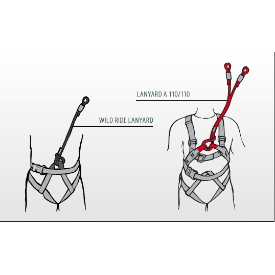 Lanyard Y určený k sebejištění v lanových parcích Větší oko se pomocí liščí smyčky instaluje do vrchního navazovacího bodu (červené barvy) postroje KOROWAI