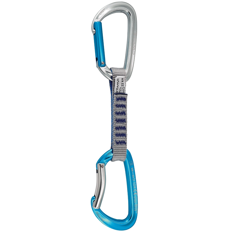 Expreska je osazena dvěma plnými karabinami CAMP Orbit – horní s rovným zámkem pro pohodlné cvakání do jištění a spodní s prohnutým zámkem pro snadné založení lana. Patentovaná úprava SphereLock zajišťuje přesné spojení nosu a zámku, čímž zvyšuje pevnost a eliminuje riziko zachycení lana.