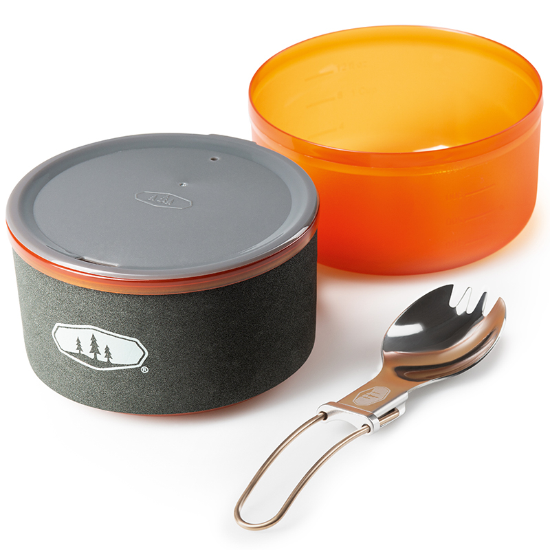 Obsahuje nízkoprofilovou konvičku z eloxovaného hliníku, misku, hrnek s neoprenovým obalem a skládací nerezovou lžícovidličku. Vše se dá úhledně složit přímo do konvičky, takže v batohu zabere minimum místa – dokonce zbyde prostor i pro malou kartuši GSI Isobutane Fuel 110 g (není součástí balení).