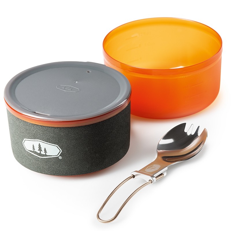 Kompaktní sada nádobí pro jednu osobu s hlavním 1,1l rendlíkem z tvrdě eloxovaného hliníku. Součástí sady je miska, hrnek s děrovaným víkem pro pití, skládací nerezová lžícovidlička, perforovaná poklička pro scezení vody a obal na celou sadu, který slouží jako nádoba na vodu nebo umyvadlo. Celá sada se dá do hlavního rendlíku složit tak šikovně, že zbyde místo i pro plynovou kartuši GSI Isobutane Fuel 230g a plynový vařič GSI Pinnacle Canister Stove, které však nejsou součástí sady. Z dalších výhod této kompaktní sady rozhodně oceníte vyraženou vnitřní stupnici objemu na rendlíku nebo sklápěcí rukojeť, která po sestavení slouží jako zámek celé sady. Tvrdě eloxovaný hliník zabraňuje oxidaci, je mechanicky odolný a skvěle rozvádí teplo do celé své plochy. Vyražená vnitřní stupnice objemu. Obal / umyvadlo na sadu. Odolný a snadno omyvatelný materiál.