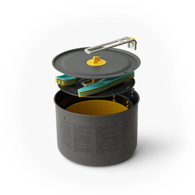 Sada nádobí Frontier UL Two Pot Cook Set 4P 14 Piece od značky Sea to Summit obsahuje dva hrnce o objemu 2 l a 3 l, čtyři misky (720 ml) a osm kusů příborů (4 vidličky a 4 nože). Vše lze snadno uložit do většího hrnce a zajistit pomocí unikátní odnímatelné rukojeti. Hrnce jsou vyrobeny z lehkého, ale odolného eloxovaného hliníku, mají vysoce oděruvzdorný keramický povrch a promyšlenou pokličku s otvory na slití vody. Praktickým detailem je háček na pokličce, díky kterému ji lze zavěsit za okraj hrnce, takže ji není nutné odkládat na zem. Uvnitř hrnců nechybí rysky pro přesné měření vody. Odnímatelná nerezová rukojeť se při používání bezpečně uzamkne a po vaření ji lze otočit přes víko pro kompaktní balení.