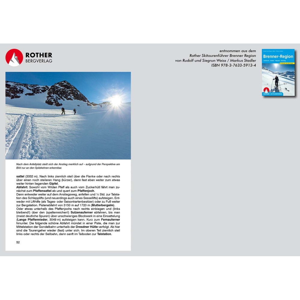 Je zde zaručen sníh, bezkonkurenční panorama vrcholů a množství možností túr pro experty i začátečníky. Rotherský průvodce skialpinismem „Brennerský region“ představuje výběr 60 nejkrásnějších túr. Túry vedou do oblasti kolem Innsbrucku, Stubaitalu a Wipptalu na severotyrolské i jihotyrolské straně, tedy do oblasti mezi Matrei a Sterzingem.