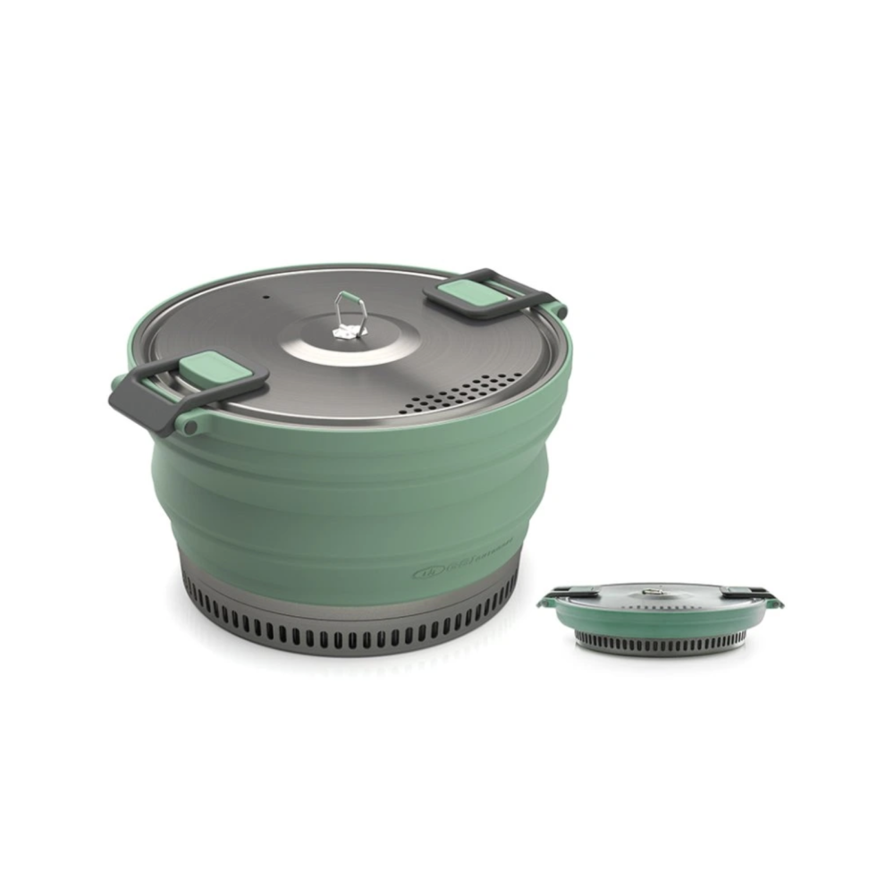 Escape HS Pot je třílitrový skládací hrnec určený pro outdoorové vaření, který vyniká úsporou místa i vysokou efektivitou. Díky silikonovému tělu lze jeho objem při sbalení zmenšit až o 53 %, přičemž výška složené sady je pouhých 5,5 cm. Hypervodivé dno z tvrdě eloxovaného hliníku s integrovaným tepelným výměníkem zajišťuje rovnoměrný rozvod tepla a zkracuje dobu vaření až o 30 %, čímž zároveň snižuje spotřebu paliva.