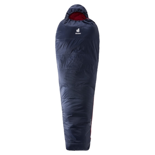Lehký letní spacák Deuter Dreamlite. Výrazný červený zip je snadno viditelný a opatřený ochranou proti zadrhávání, včetně horního překrytí se suchým zipem pro lepší izolaci.
