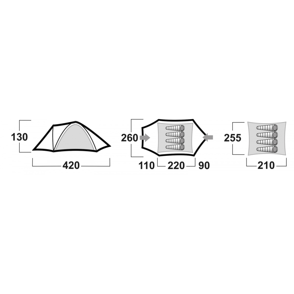 - Konstrukce: dvouplášťový samonosný stan s vnitřní konstrukcí
