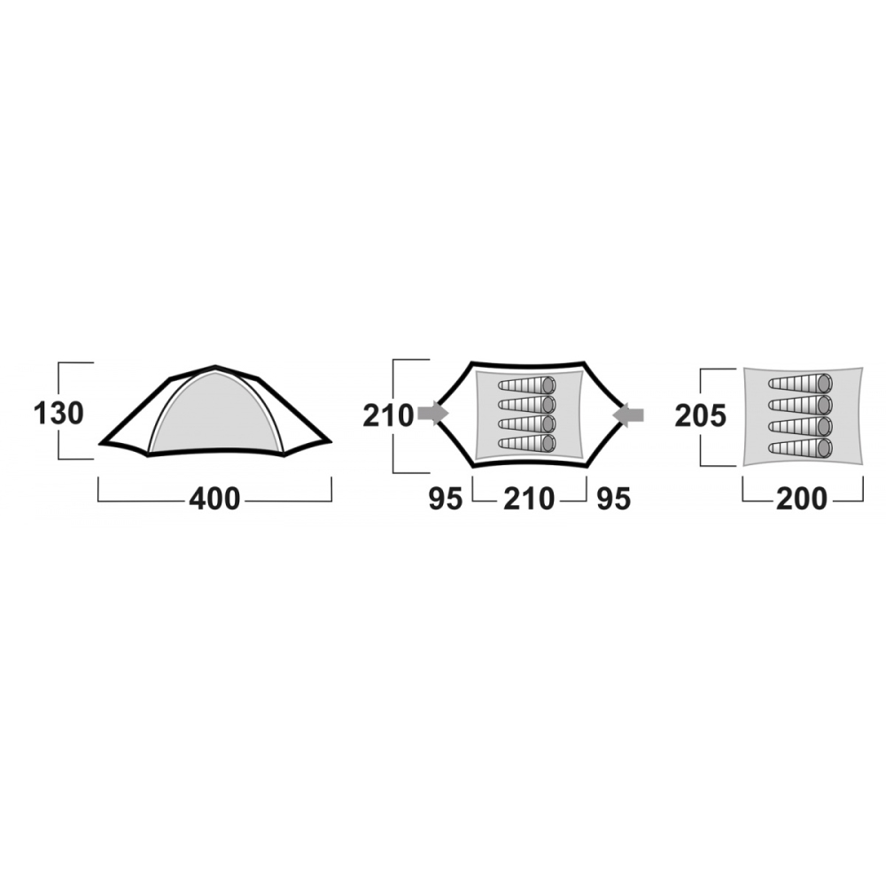 - Vnější stan: 185T Polyester, PU zátěr 4 000 mm/cm2, podlepené švy