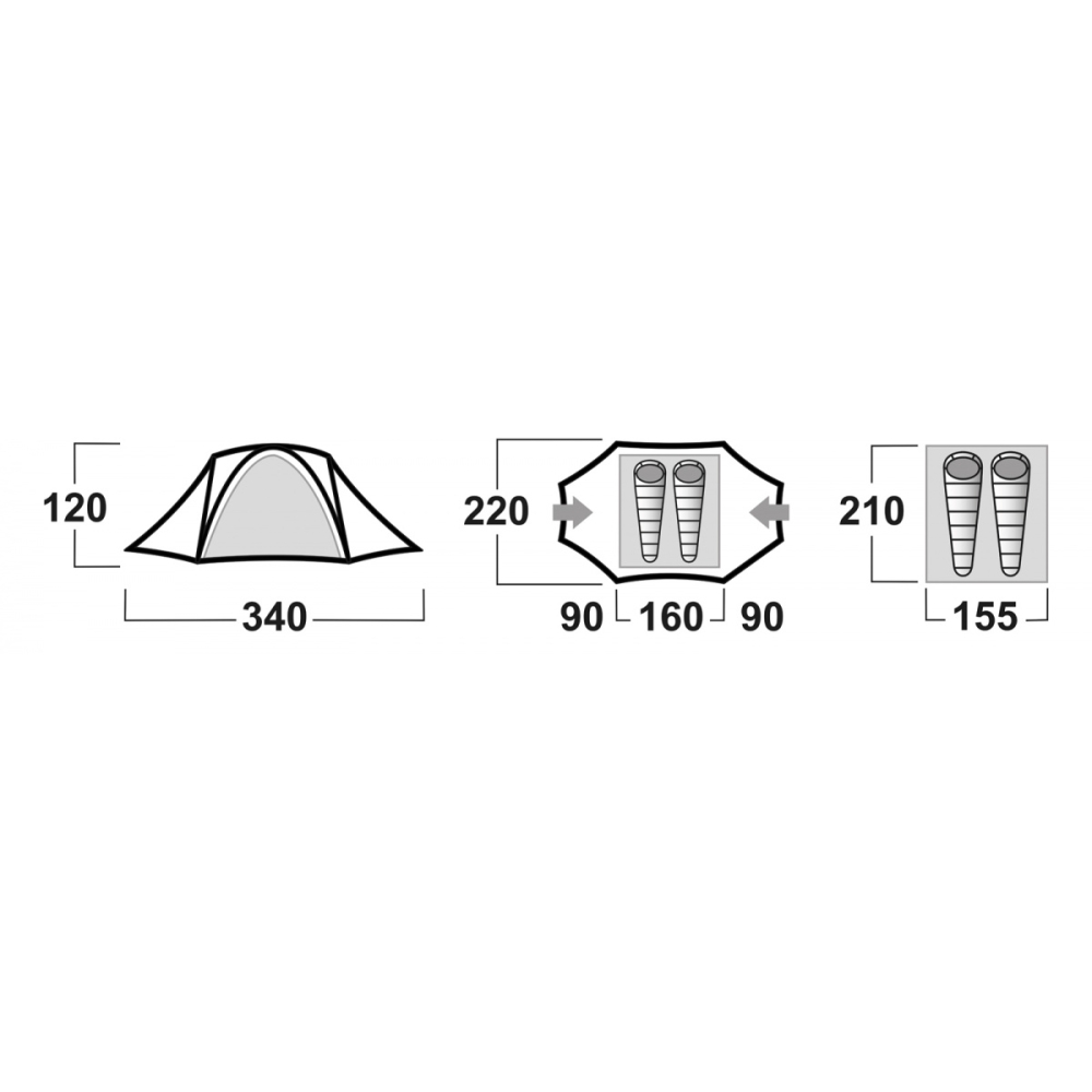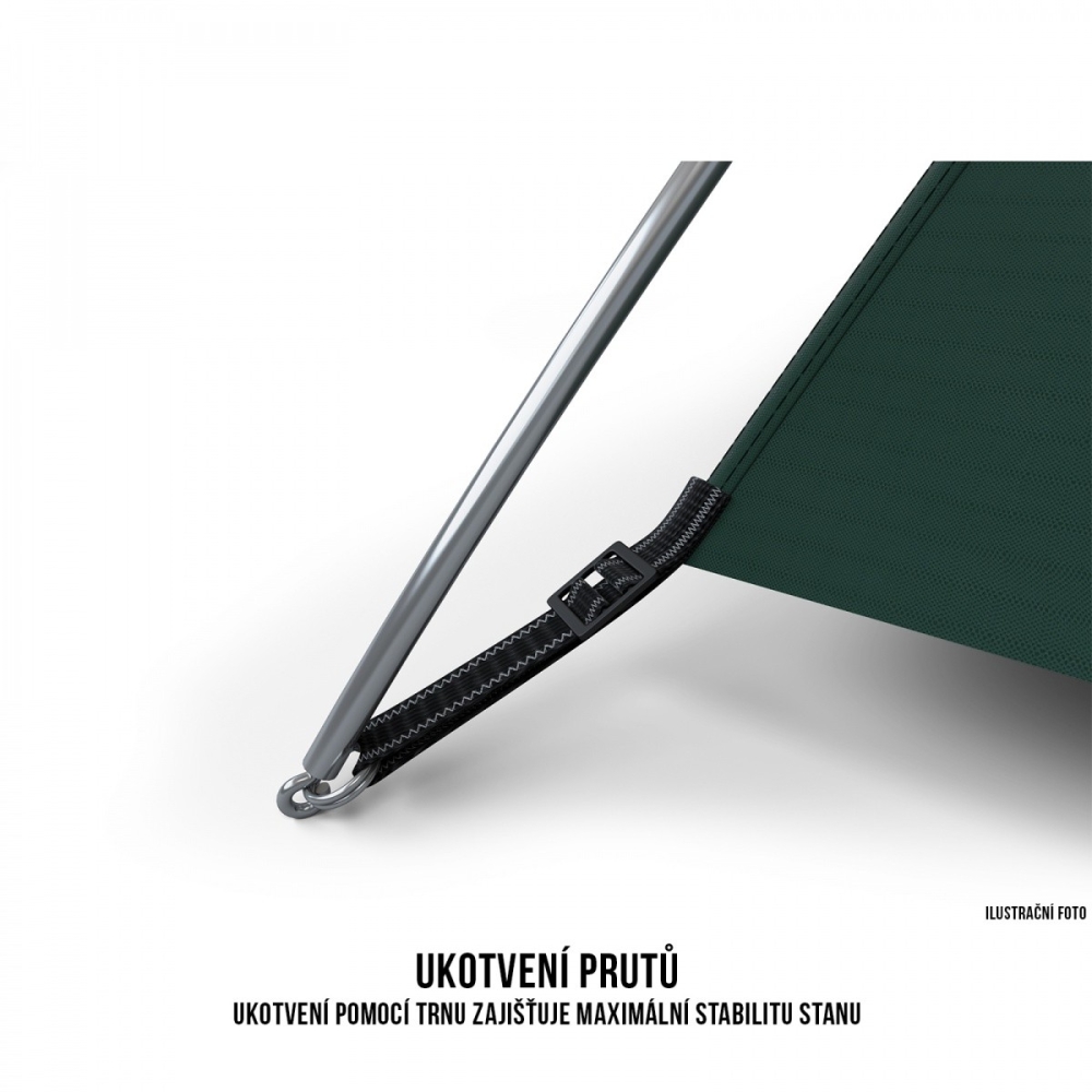 - Vnější stan: 210T Polyester RipStop, PU zátěr 7 000 mm/cm2, podlepené švy