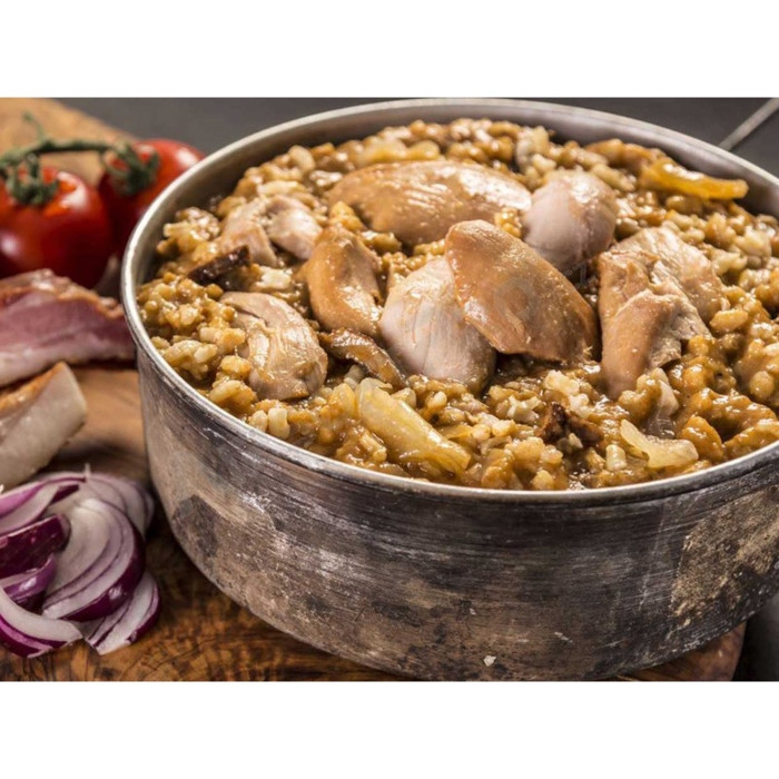 Jedno z nejoblíbenějších jídel, díky skvěle vývážené chuti a nutriční hodnotě. V omáčce s kusy cibule, špekem, rajským protlakem jsou Kuřecí stehenní kousky pečené v páře. Celozrná rýže natural propojená s omáčkou dotváří celek i díky tomu, že je mimořádně bohatá na vitamíny a vlákninu.
