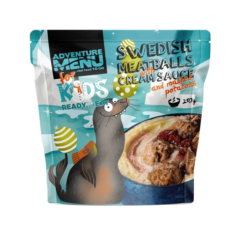 Každý velký dobrodruh začíná malými krůčky. S krátkýma nohama je to ale větší štreka, a tak dostanou malí dobrodruzi rychle velký hlad. Ten ale nebývá jen tak ledajaký! Je to "hlad na něco dobrýho". Proto jsme připravili jídla plná energie, 100% přírodních surovin a uvařená speciálně pro dětské chutě. Prckům se budou dělat boule za ušima. Ale sbíhat sliny se budou i dospělákům. Pro tuhle severskou dobrotu, po které děti doslova šílí, už nemusíte do modro-žluté divočiny. Můžete s mrňousy divočit v přírodě s jistotou, že jim výlet zachutná. Jemně kořeněné kuličky z mletého vepřového a hovězího, smetanová omáčka, sametová kaše a navrch veselé brusinky to jistí. Tak ploutev na to, že jim je nesníte. Bramborová kaše (38 %) (brambory, mléko), krémová omáčka (34 %) (smetana, hovězí vývar, zeleninový vývar, máslo (mléko), mouka kukuřičná, mouka rýžová, dijonská hořčice (voda, hořčičné semeno, lihový ocet, sůl), sojová omáčka (pitná voda, sojové boby (24 %) (sója), cukr, sůl, pšeničná mouka), masové kuličky (24 %) (hovězí maso mleté, vepřové maso mleté, cibule, vejce, petrželová nať, kopr, pažitka, libeček, sůl, nové koření, pepř, kardamom), brusinky (4 %).