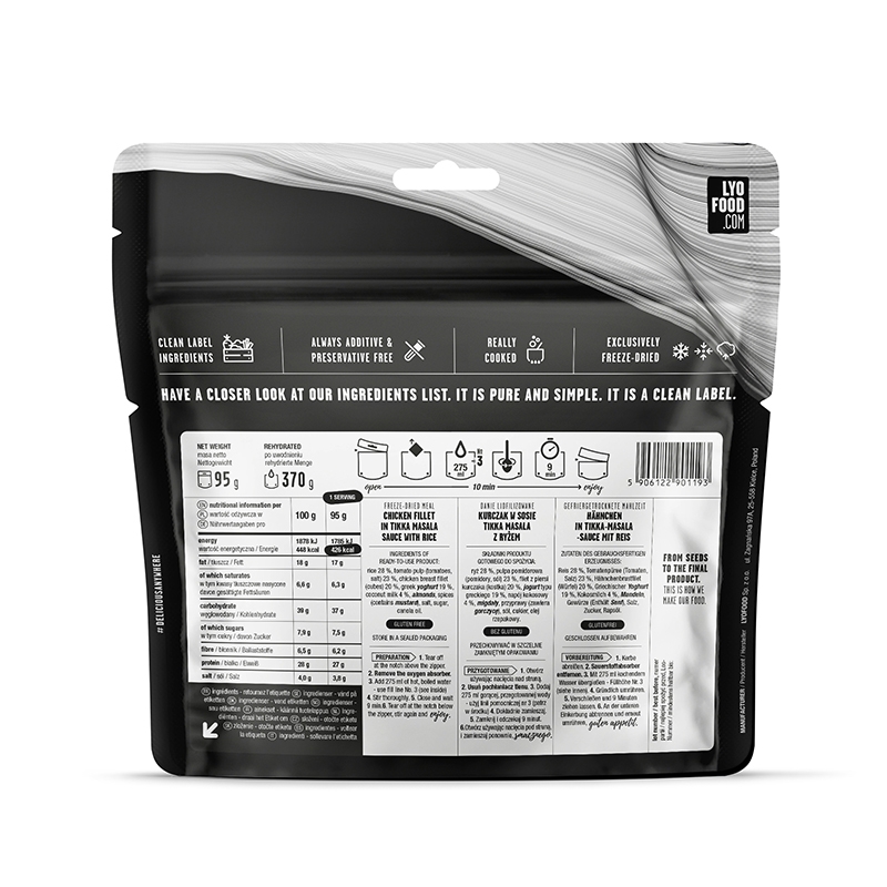 Kuřecí Tikka Masala je připravena z čerstvých, 100% přírodních surovin bez konzervantů a umělých přísad. Díky speciálnímu hliníkovému obalu je jídlo chráněno před vlhkostí i teplotními výkyvy, a tak si zachovává výživovou hodnotu, chuť i aroma. Stačí zalít horkou vodou a během pár minut máte chutné a vydatné jídlo připravené k okamžité konzumaci.