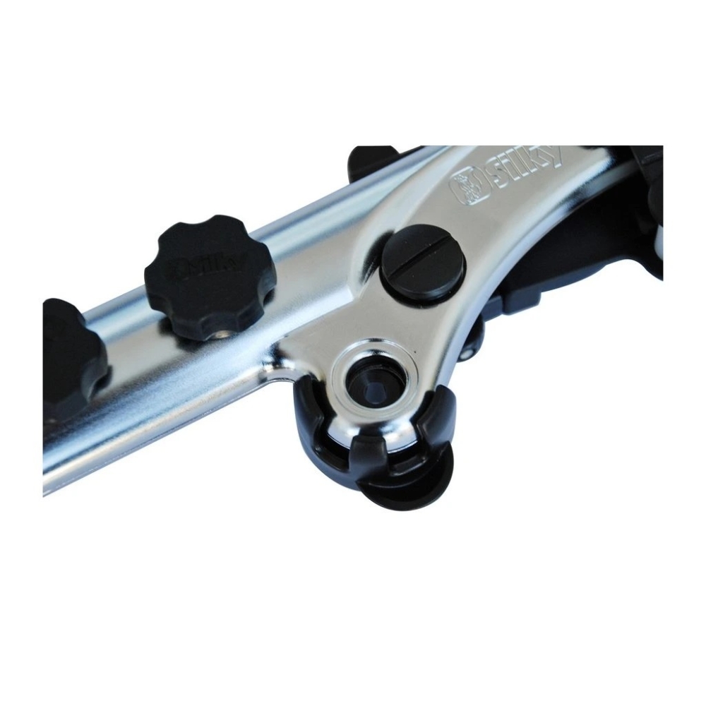 Oválná hliníková tyč poskytuje vysokou tuhost a přesné vedení čepele při řezu, čímž zajišťuje optimální kontrolu nad pohybem pily. Dvojitý uzamykací systém – tlačítkový a pákový zámek – garantuje maximální bezpečnost a stabilitu při práci. Spodní část je potažena gumou pro pohodlný a jistý úchop a zakončena nárazníkem, který chrání tyč před poškozením.