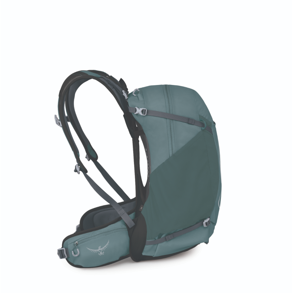 Dva postranní kompresní popruhy v horní části s fixací trekových holí a spodní kompresní popruhy pro dodatečnou regulaci zatížení. Dvě poutka na trekové hole. Vnitřní kapsa na hydrovak s výstupem na picí hadičku v zádovém panelu a klipem Osprey Hydraclip pro snadné zavěšení hydrovaku.